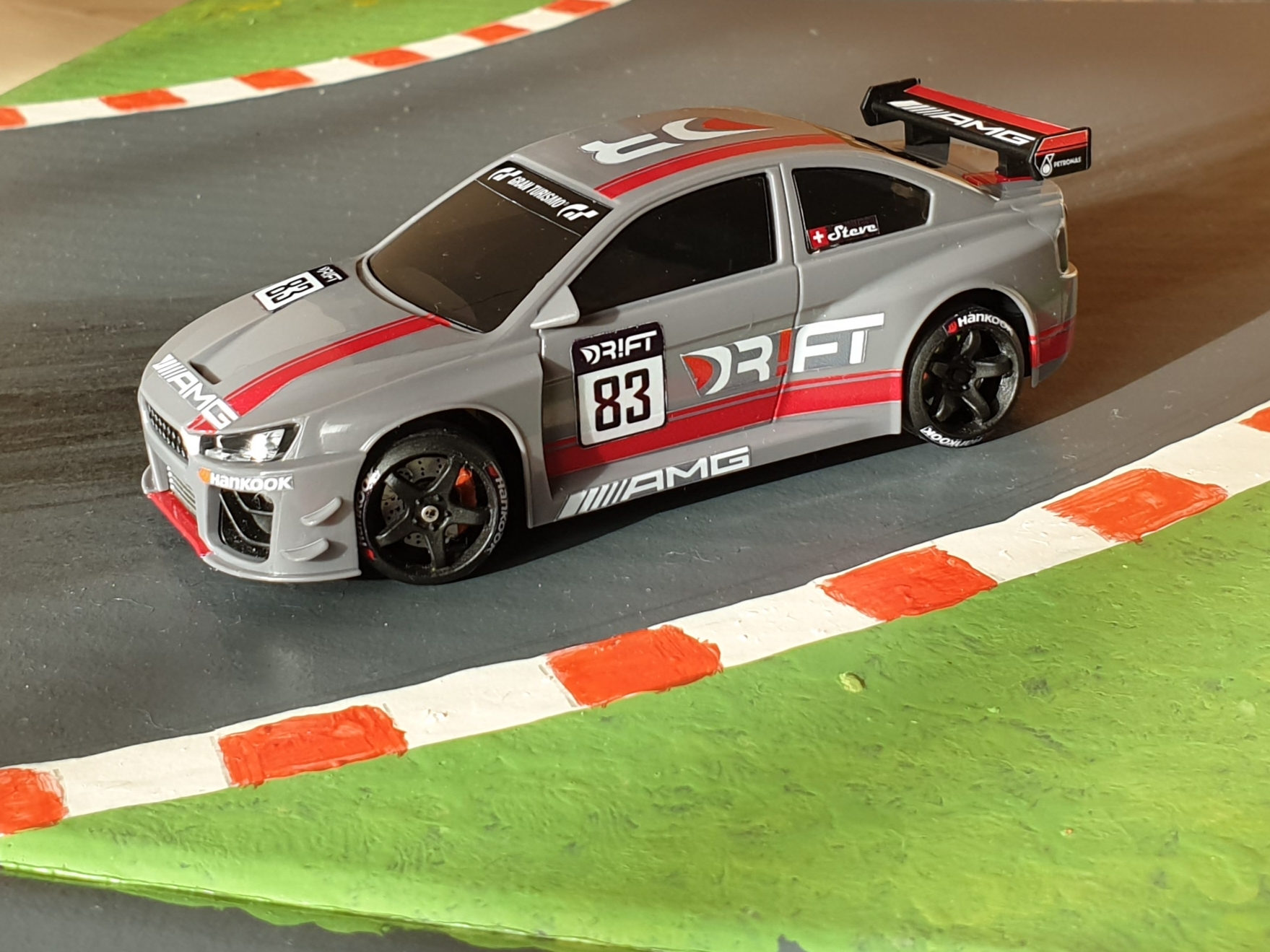 AMG GT DR!FT. Die Decals habe ich mit der weißen Decalfolie und Inkjetdrucker hergestellt. Nicht übel das Ergebnis.